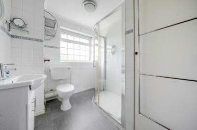 Refitted shower room, obscured glazed UPVC window to rear aspect, tiled floor, white 3 piece suite comprising of over sized curved shower enclosure, WC & vanity unit mounted wash hand basin, heated towel rail. Airing cupboard.